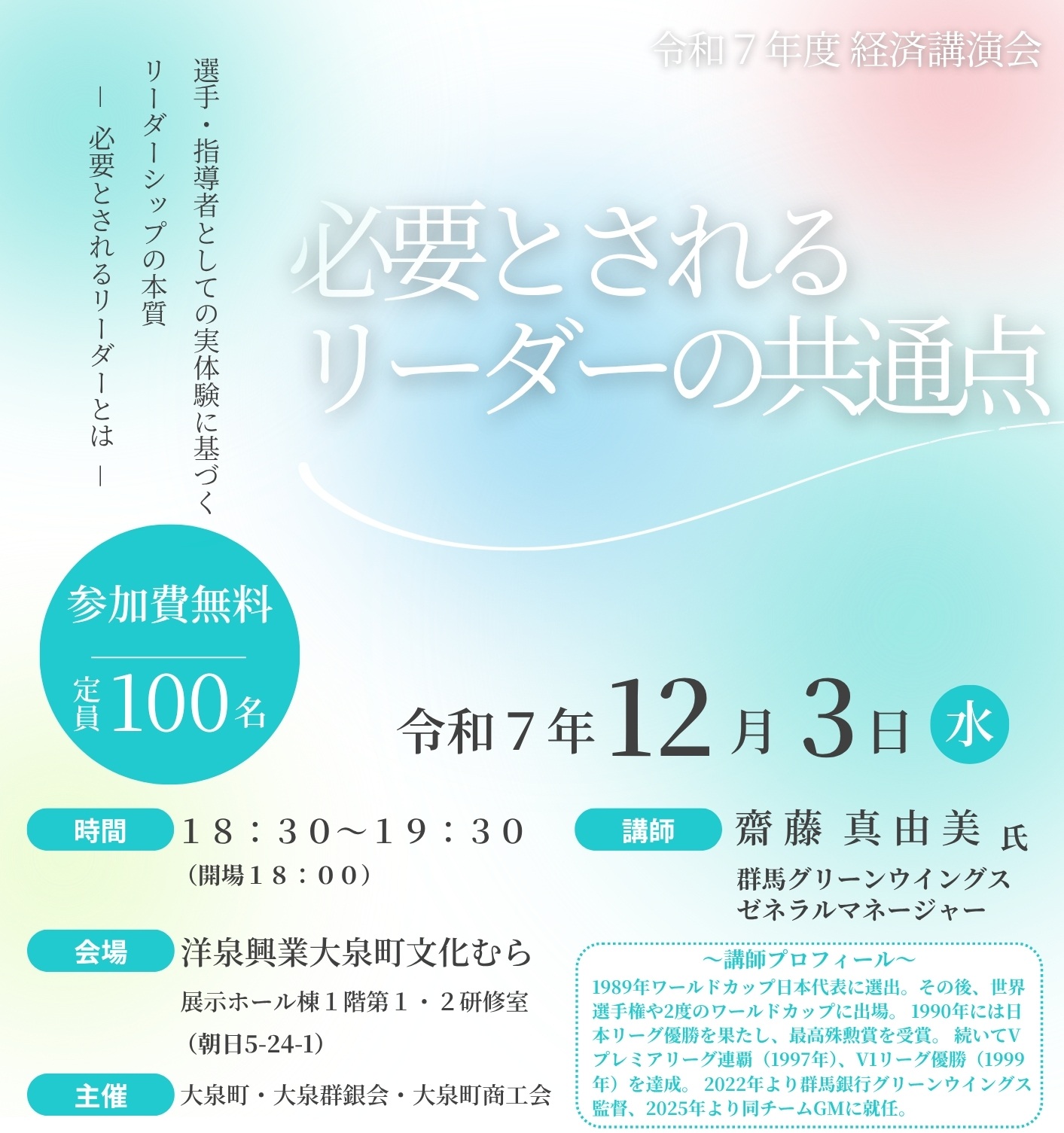 大泉町商工会では、大泉群銀会、大泉町と共催して、経済講演会を開催いたします。